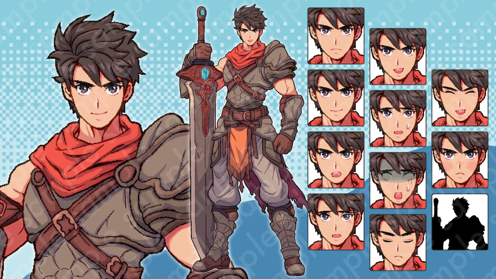 Pixel Art Character Design Assets: Hero - Brown-haired Swordsman with 10 Expressions + More